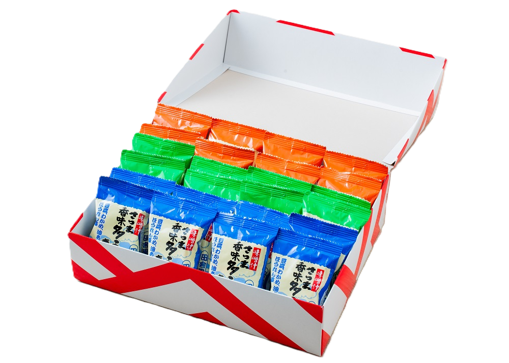 | 特徴 | <さつま香味多こうじ麦みそ> 当社自慢の麦みそに豆腐、わかめ、油あげ、ほうれん草を使った、オーソドックスな田舎風おみそ汁です。 |